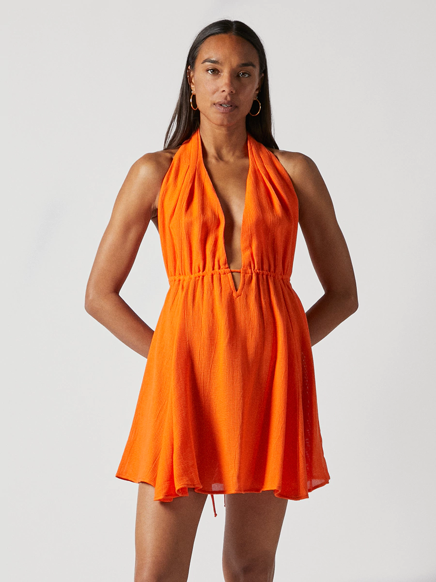 El vestido Mili es un mini vestido suelto con cuello halter y espalda descubierta, que brinda un ajuste cómodo y con estilo.