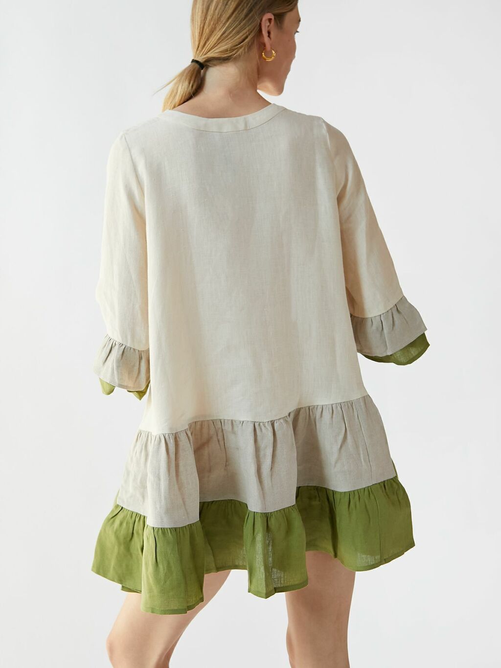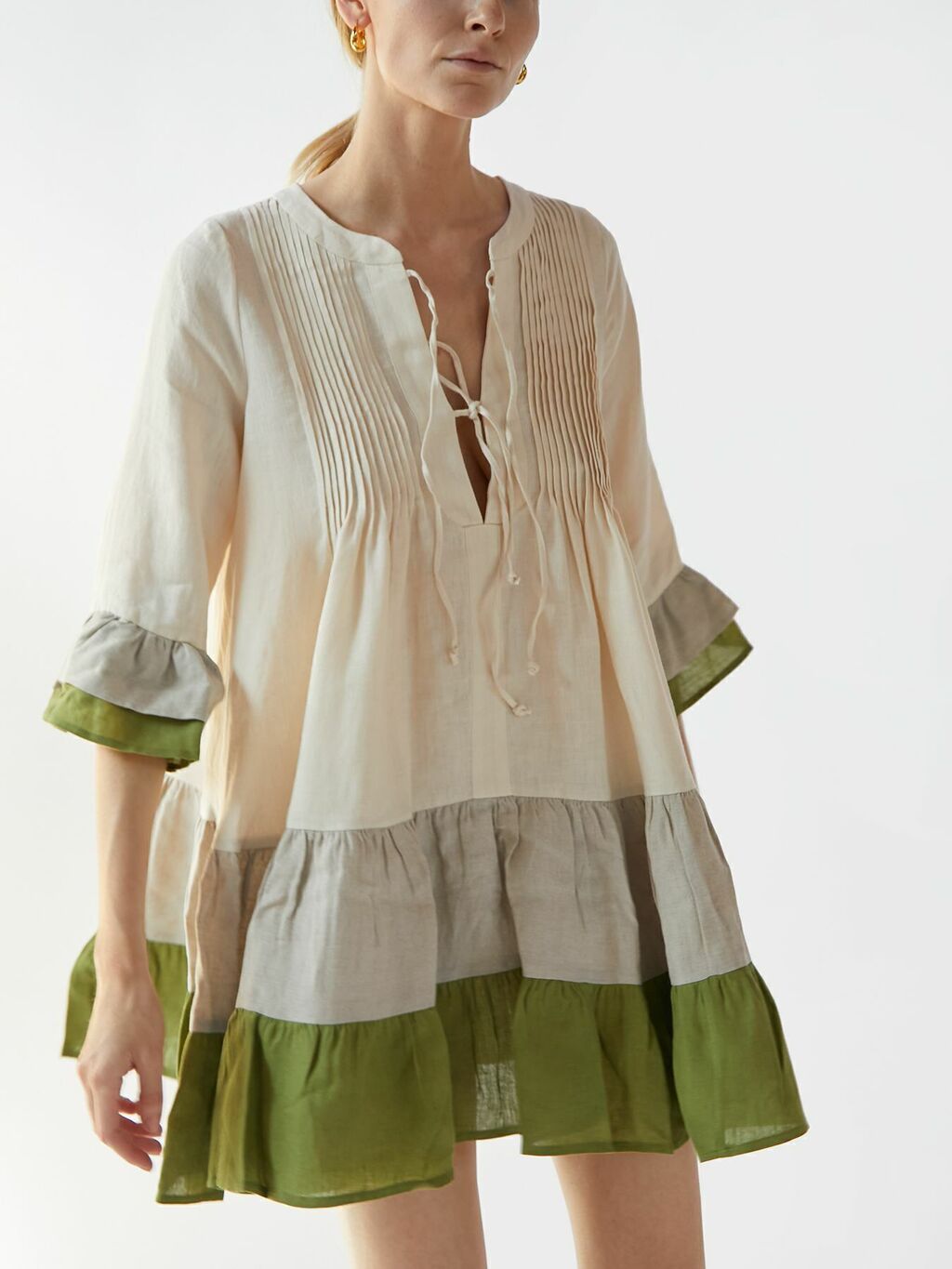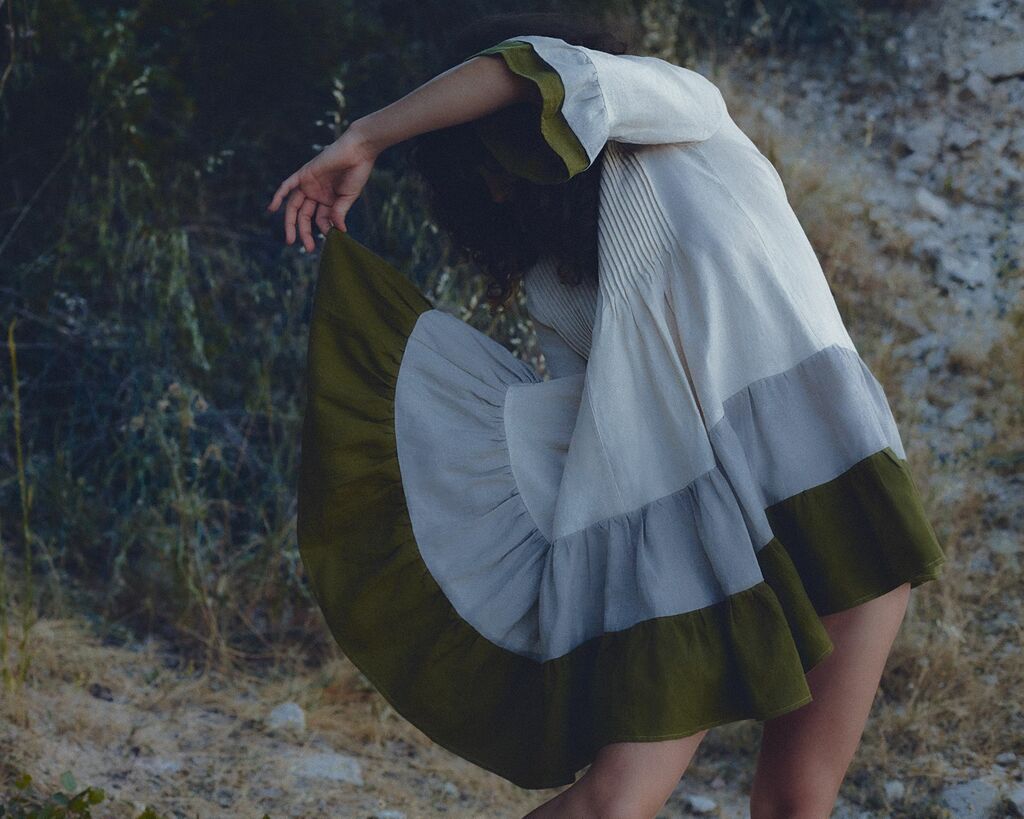 El vestido Nina está confeccionado con lino orgánico belga, en una silueta femenina, con un ajuste relajado que se moldea con un busto con pinzas y una falda escalonada, y un enmarcado con mangas acampanadas.